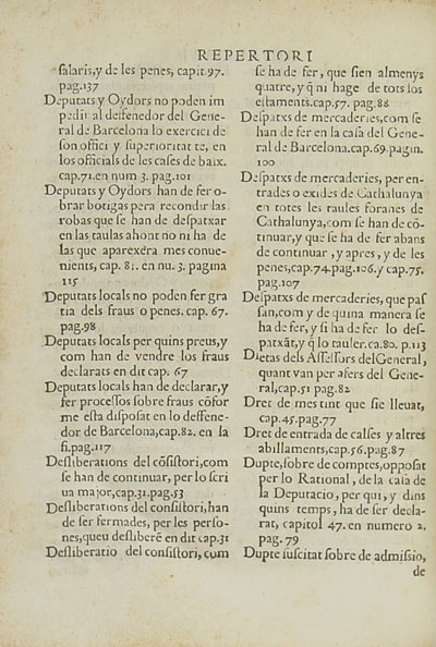 Capitols del General del Principat de Cathalunya, comptats de Rossello y Cerdanya fets en les Corts... lo any M. D. XCIX |