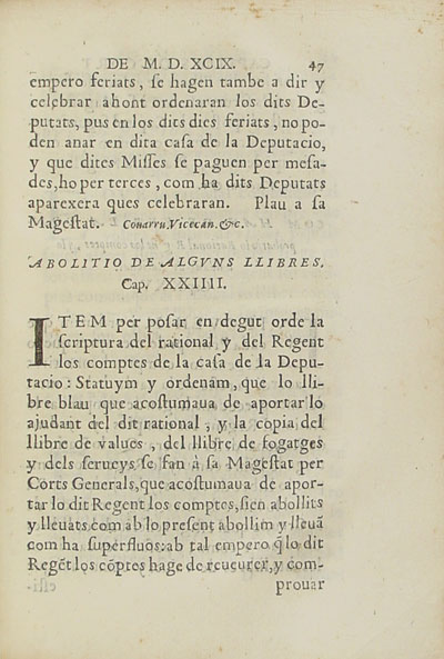 Capitols del General del Principat de Cathalunya, comptats de Rossello y Cerdanya fets en les Corts... lo any M. D. XCIX |
