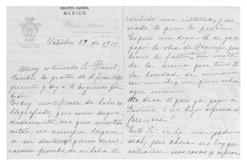 [Carta de Carmen Romero Rubio de Díaz a Enrique Danel en México. París, 29 de octubre de 1911]